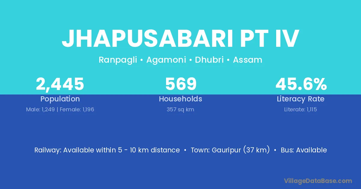 Jhapusabari Pt Iv village has a total population of 2,445 people, of which 1,249 are males and 1,196 are females.