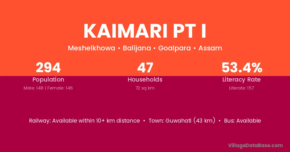 Gauripur (39 km) is the nearest town to Kaimari Pt I village for major economic activities and is located approximately 39 km away.