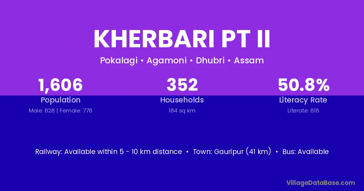 Gauripur (41 km) is the nearest town to Kherbari Pt Ii village for major economic activities and is located approximately 41 km away.