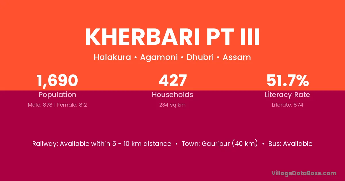 Gauripur (40 km) is the nearest town to Kherbari Pt Iii village for major economic activities and is located approximately 40 km away.