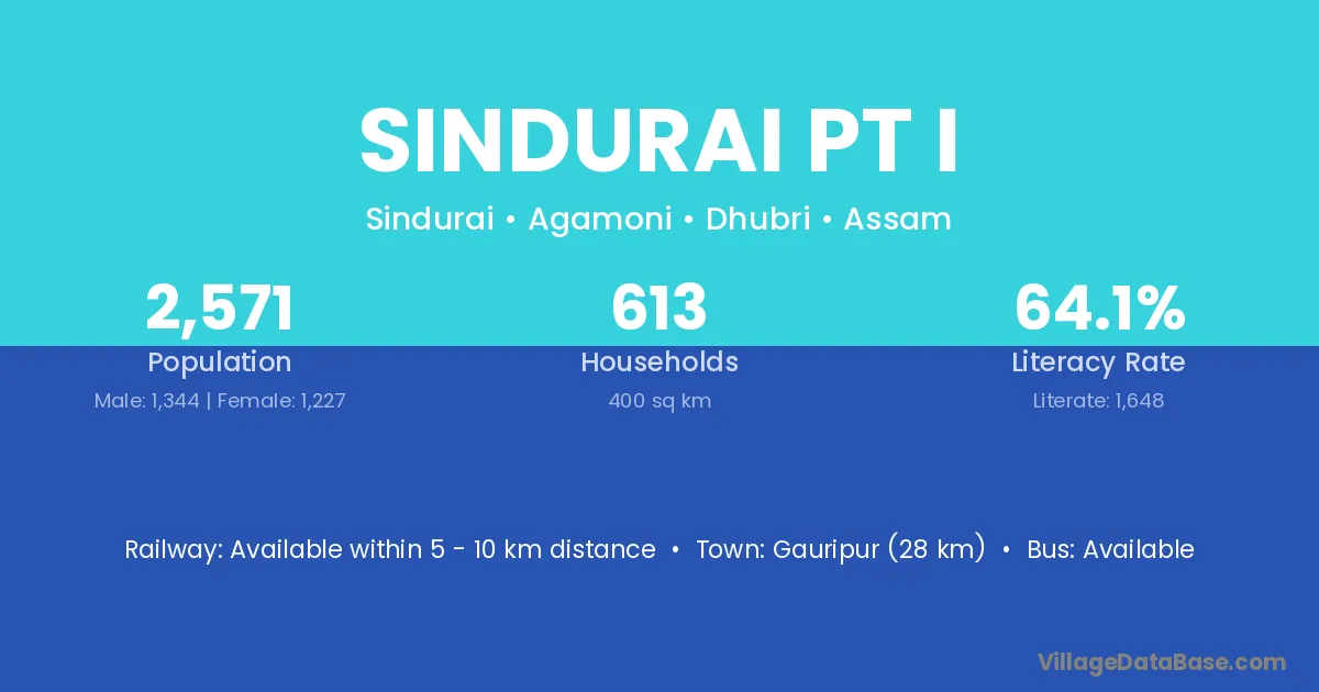 Gauripur (28 km) is the nearest town to Sindurai Pt I village for major economic activities and is located approximately 28 km away.