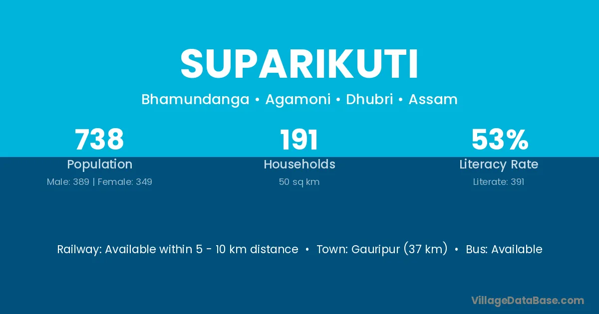 Gauripur (37 km) is the nearest town to Suparikuti village for major economic activities and is located approximately 37 km away.