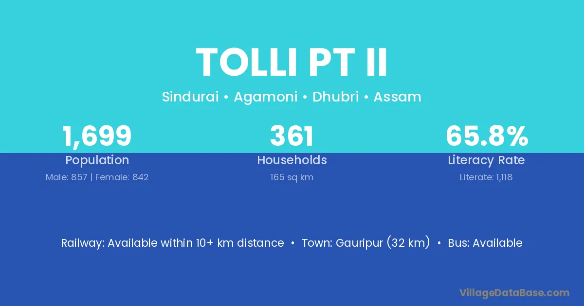 Gauripur (32 km) is the nearest town to Tolli Pt Ii village for major economic activities and is located approximately 32 km away.
