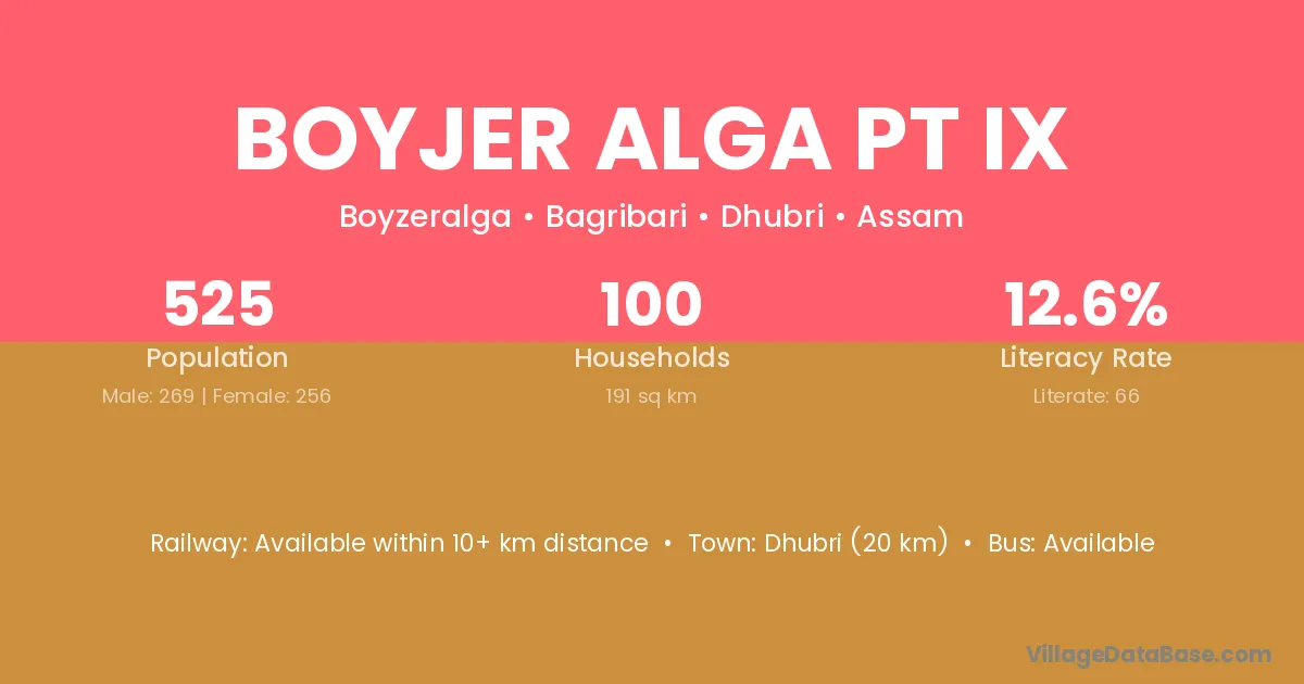 Dhubri (20 km) is the nearest town to Boyjer Alga Pt Ix village for major economic activities and is located approximately 20 km away.