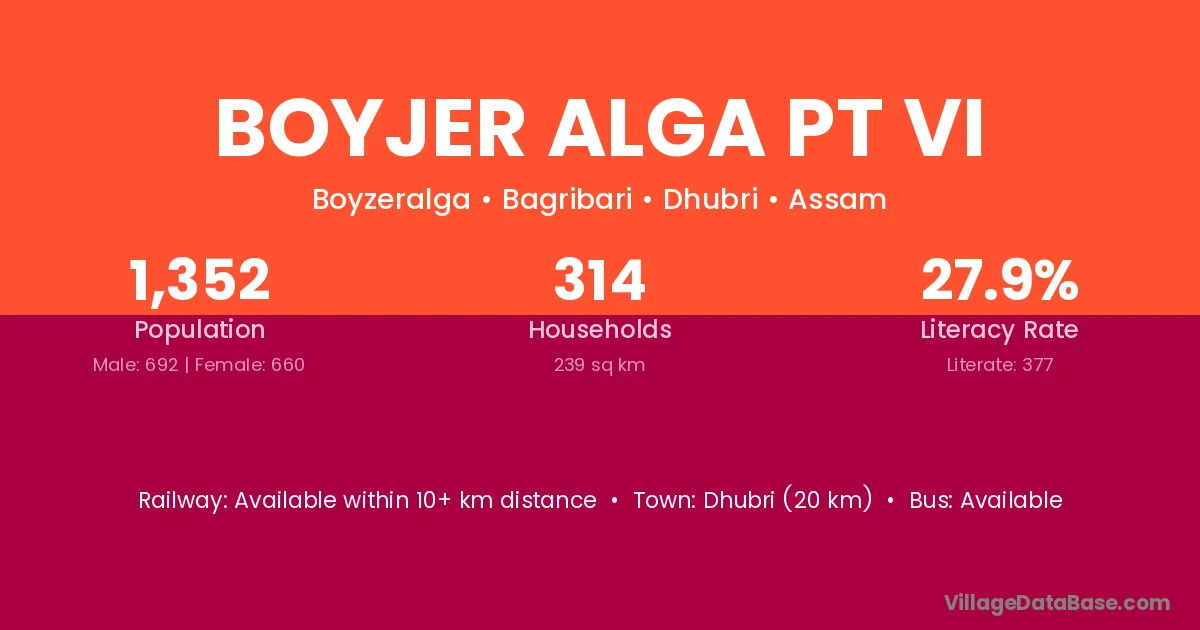 Dhubri (20 km) is the nearest town to Boyjer Alga Pt Vi village for major economic activities and is located approximately 20 km away.