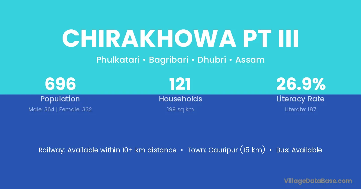 Gauripur (15 km) is the nearest town to Chirakhowa Pt Iii village for major economic activities and is located approximately 15 km away.