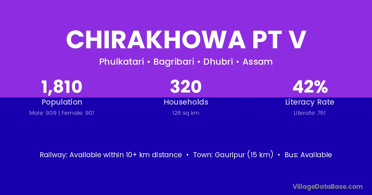 Gauripur (15 km) is the nearest town to Chirakhowa Pt V village for major economic activities and is located approximately 15 km away.