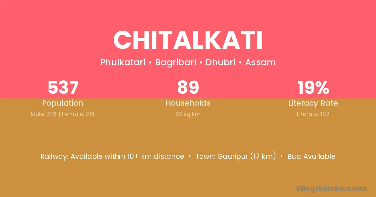 Gauripur (17 km) is the nearest town to Chitalkati village for major economic activities and is located approximately 17 km away.