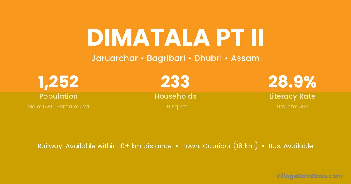 Gauripur (18 km) is the nearest town to Dimatala Pt Ii village for major economic activities and is located approximately 18 km away.