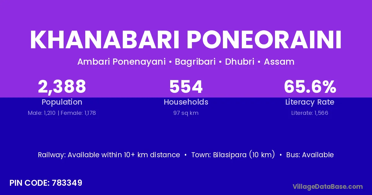 Bilasipara (10 km) is the nearest town to Khanabari Poneoraini village for major economic activities and is located approximately 10 km away.