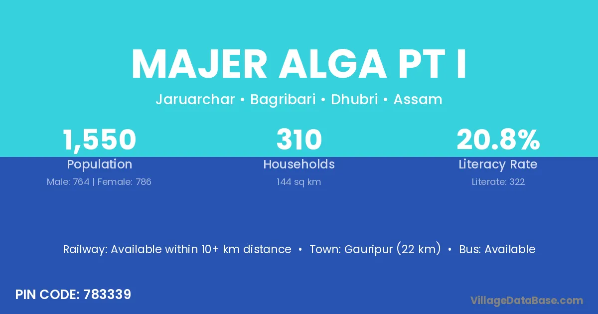 Gauripur (22 km) is the nearest town to Majer Alga Pt I village for major economic activities and is located approximately 22 km away.