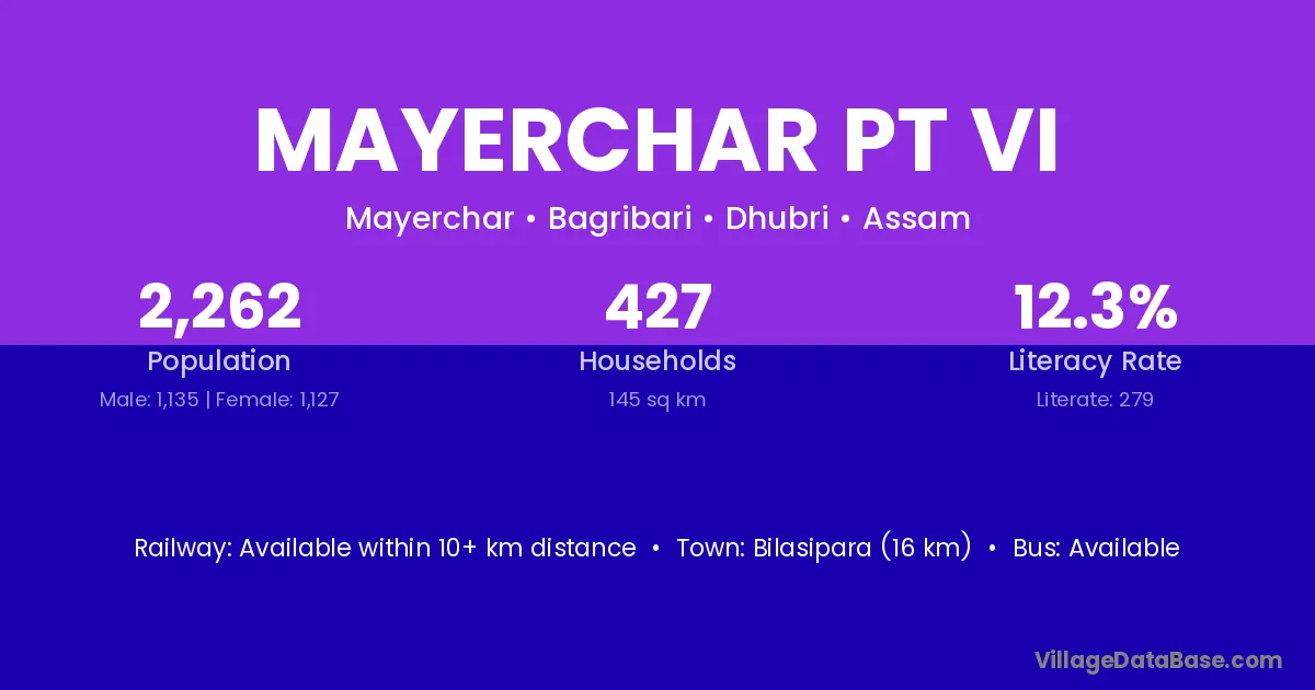Bilasipara (16 km) is the nearest town to Mayerchar Pt Vi village for major economic activities and is located approximately 16 km away.