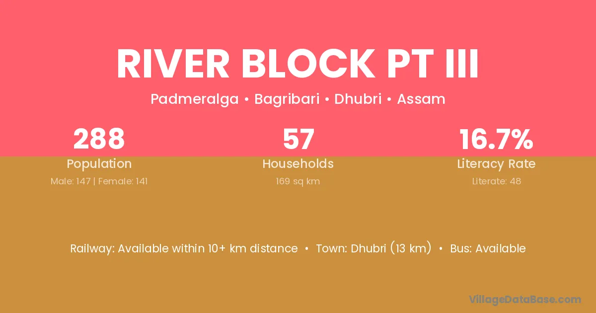 Dhubri (13 km) is the nearest town to River Block Pt Iii village for major economic activities and is located approximately 13 km away.