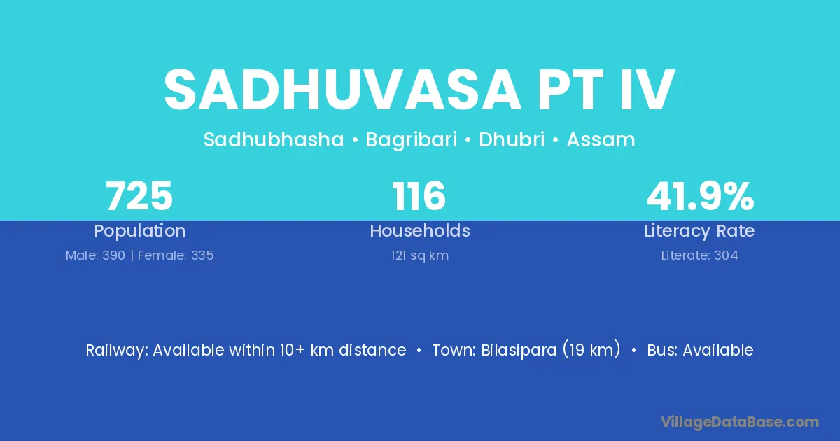 Bilasipara (19 km) is the nearest town to Sadhuvasa Pt Iv village for major economic activities and is located approximately 19 km away.