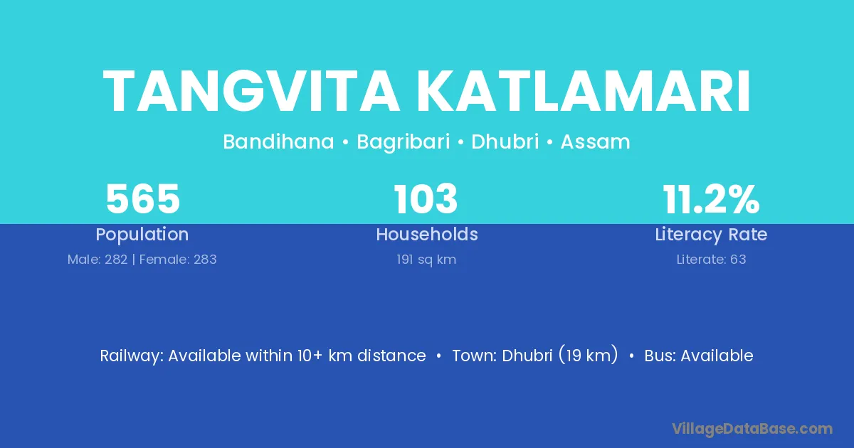 Dhubri (19 km) is the nearest town to Tangvita Katlamari village for major economic activities and is located approximately 19 km away.