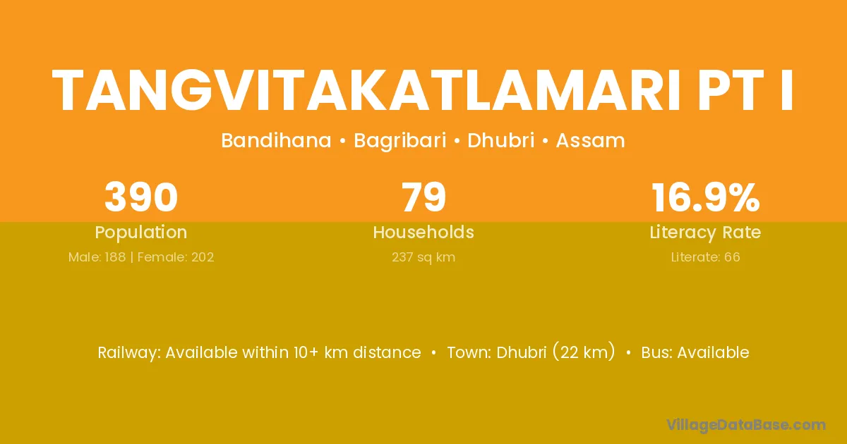 Dhubri (22 km) is the nearest town to Tangvitakatlamari Pt I village for major economic activities and is located approximately 22 km away.
