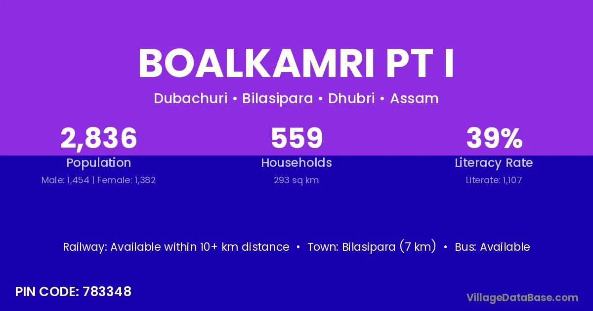 Bilasipara (7 km) is the nearest town to Boalkamri Pt I village for major economic activities and is located approximately 7 km away.