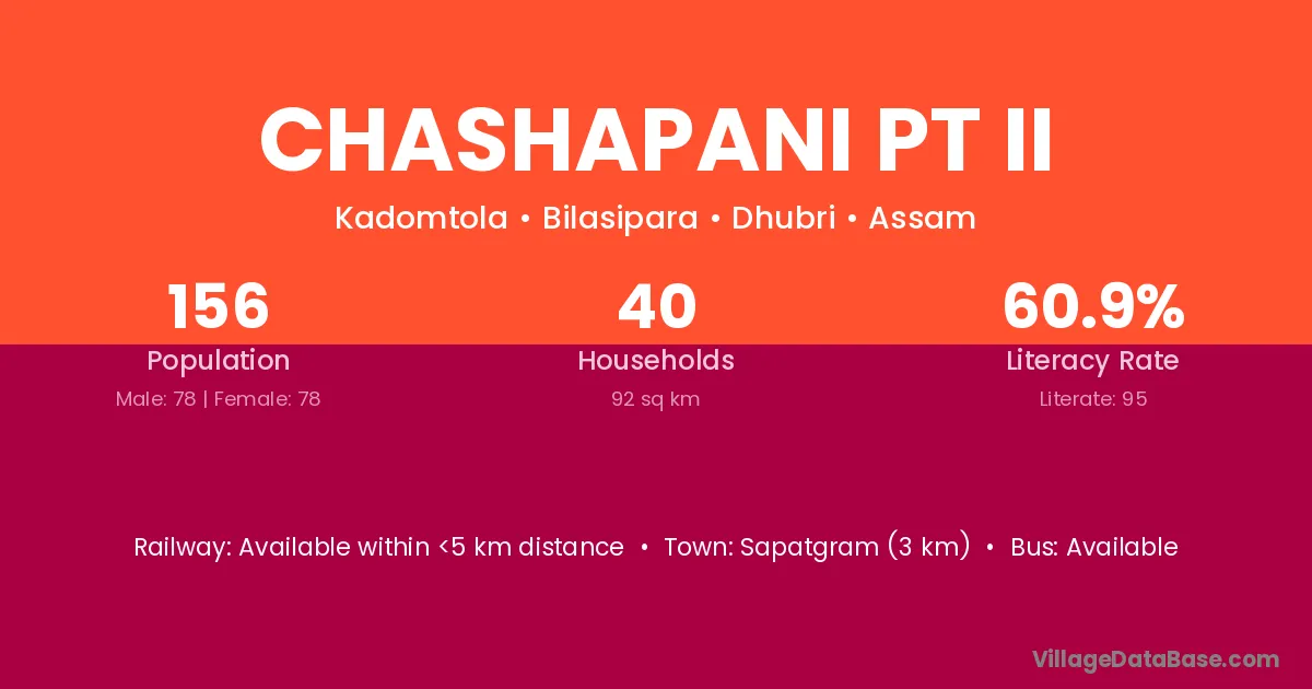 Chashapani Pt Ii village has a total population of 156 people, of which 78 are males and 78 are females.