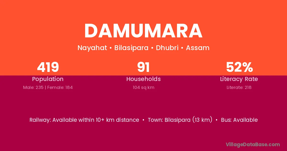 Bilasipara (13 km) is the nearest town to Damumara village for major economic activities and is located approximately 13 km away.