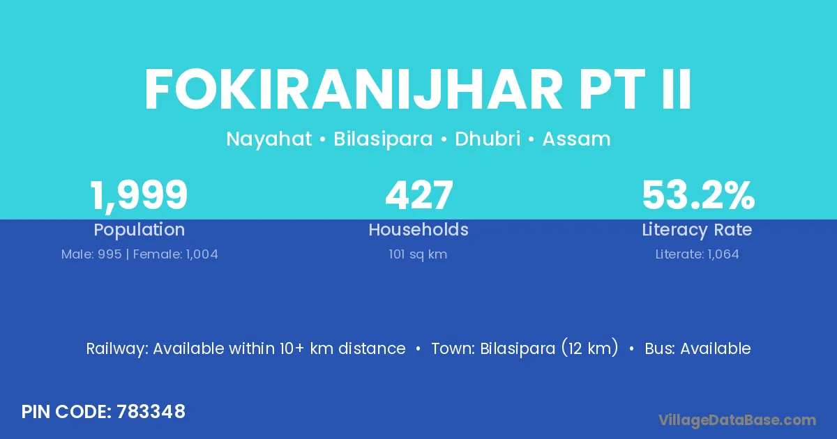 Fokiranijhar Pt Ii village has a total population of 1,999 people, of which 995 are males and 1,004 are females.