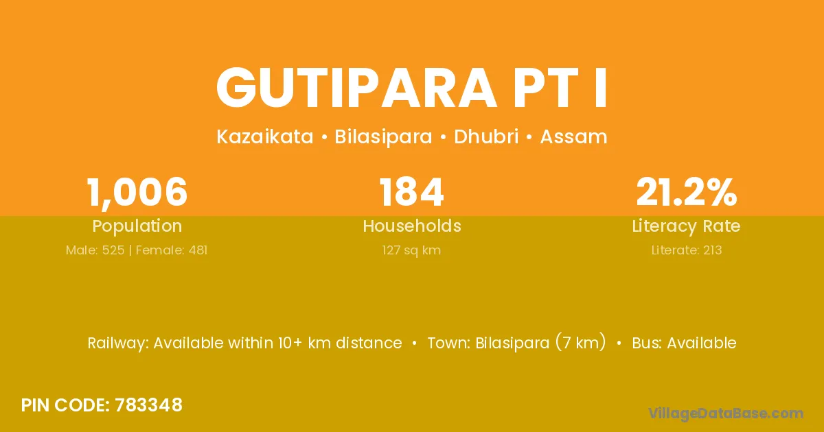 Bilasipara (7 km) is the nearest town to Gutipara Pt I village for major economic activities and is located approximately 7 km away.