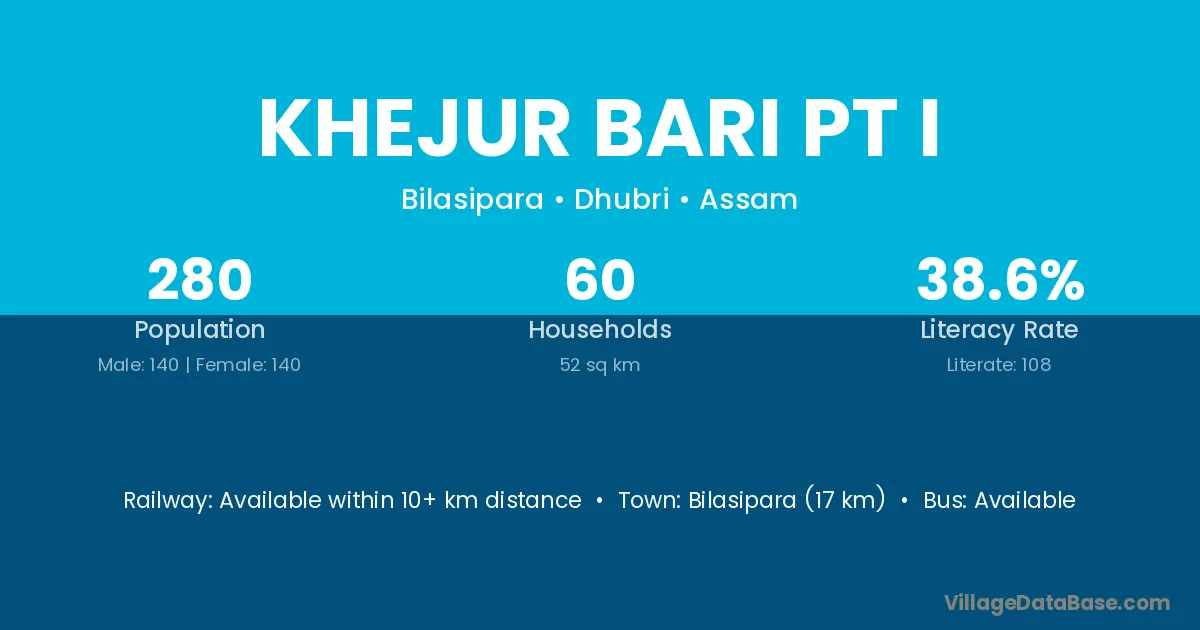 Bilasipara (17 km) is the nearest town to Khejur Bari Pt I village for major economic activities and is located approximately 17 km away.
