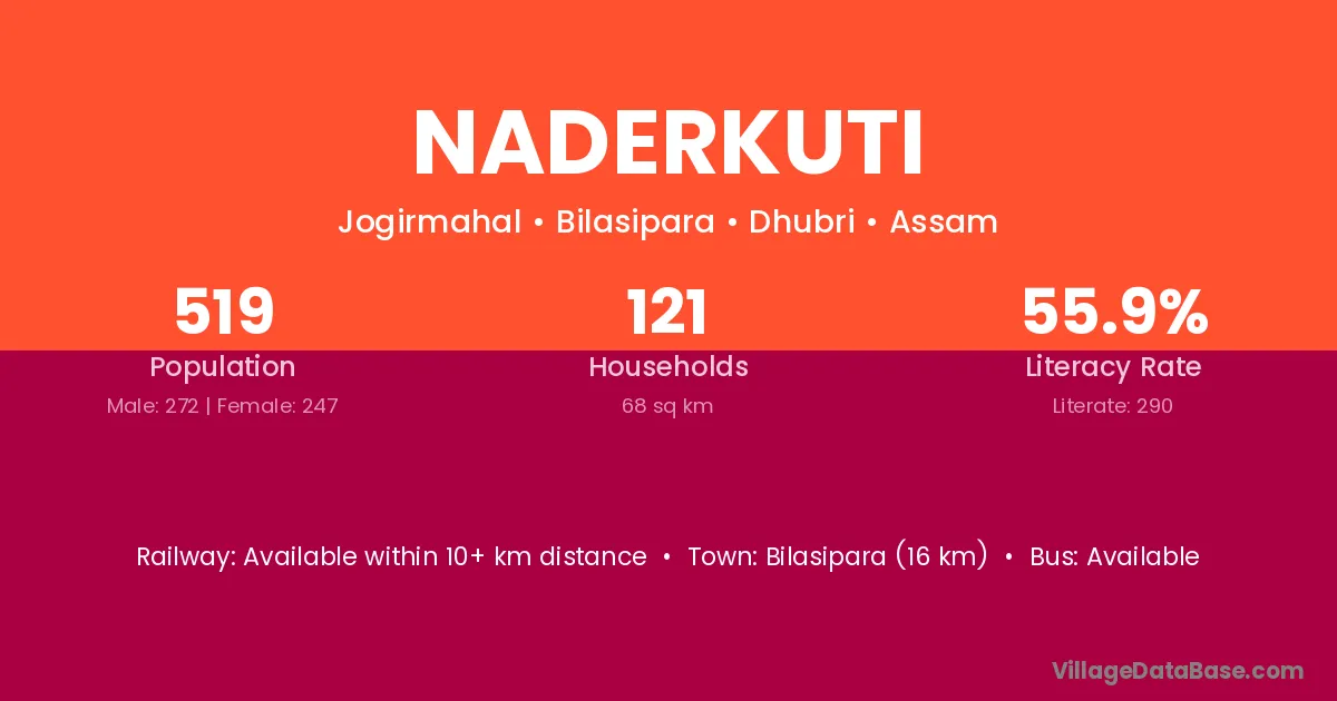 Bilasipara (16 km) is the nearest town to Naderkuti village for major economic activities and is located approximately 16 km away.