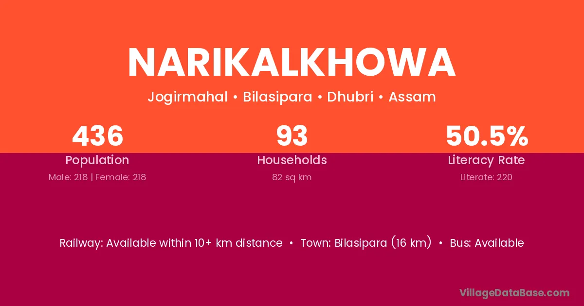 Bilasipara (16 km) is the nearest town to Narikalkhowa village for major economic activities and is located approximately 16 km away.