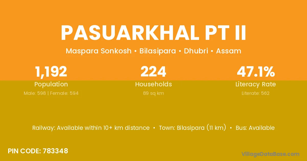 Bilasipara (11 km) is the nearest town to Pasuarkhal Pt Ii village for major economic activities and is located approximately 11 km away.