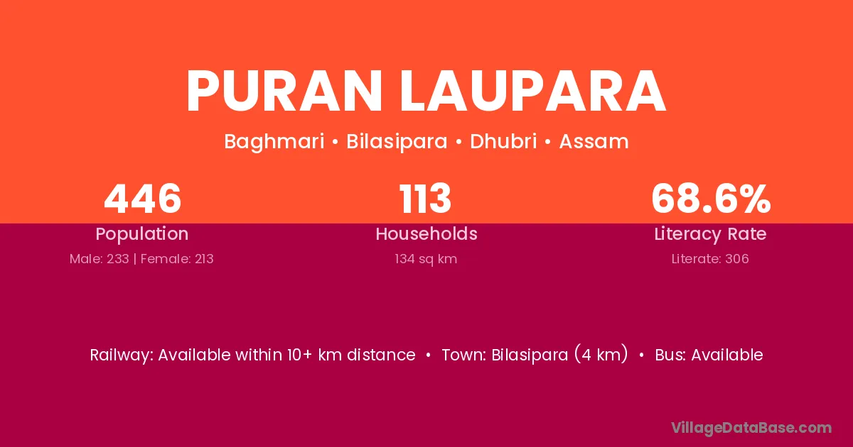 Bilasipara (4 km) is the nearest town to Puran Laupara village for major economic activities and is located approximately 4 km away.