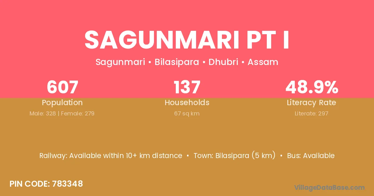 Bilasipara (5 km) is the nearest town to Sagunmari Pt I village for major economic activities and is located approximately 5 km away.