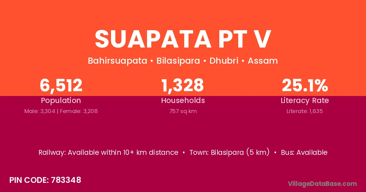 Bilasipara (5 km) is the nearest town to Suapata Pt V village for major economic activities and is located approximately 5 km away.