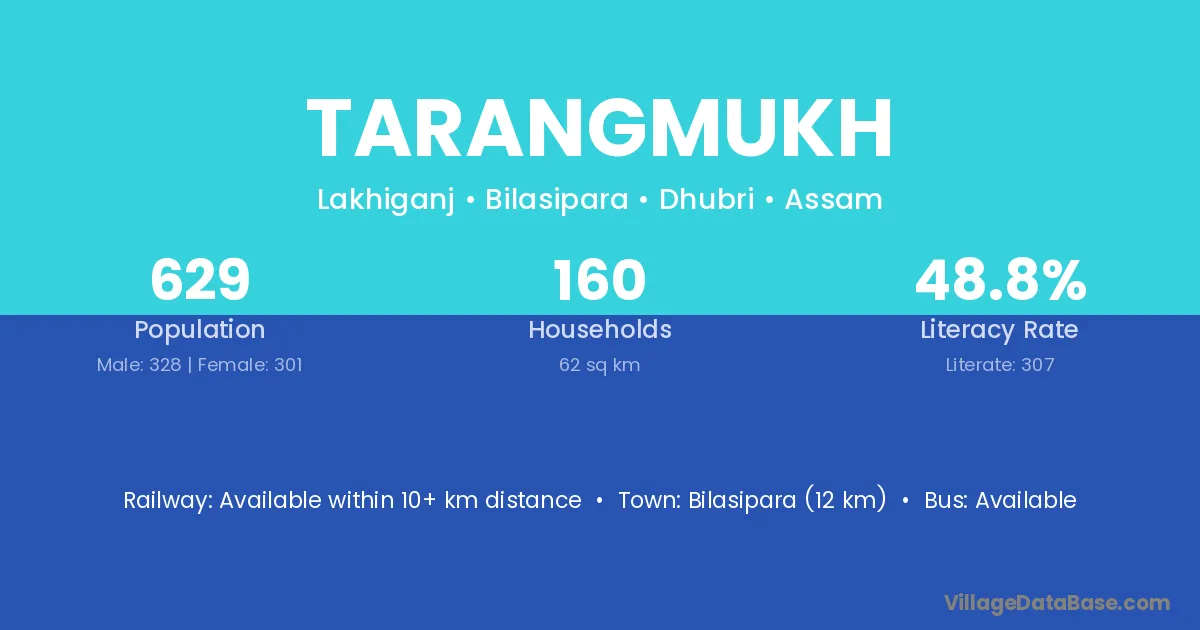 Bilasipara (12 km) is the nearest town to Tarangmukh village for major economic activities and is located approximately 12 km away.