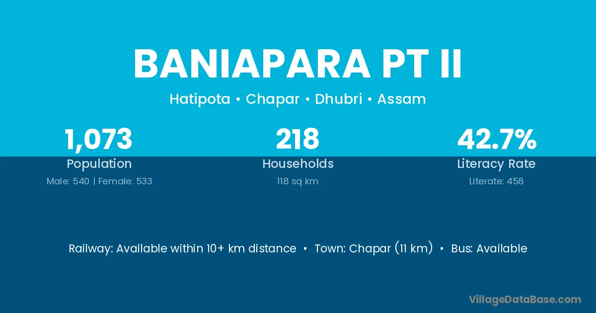Baniapara Pt Ii village has a total population of 1,073 people, of which 540 are males and 533 are females.