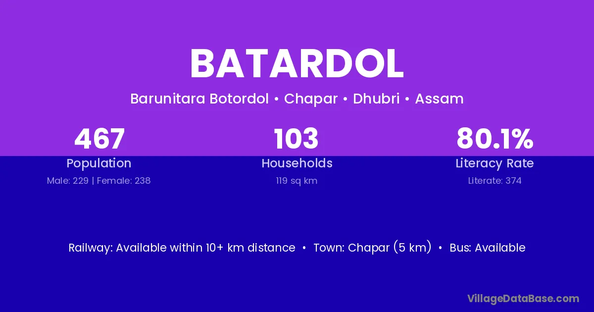 Chapar (5 km) is the nearest town to Batardol village for major economic activities and is located approximately 5 km away.