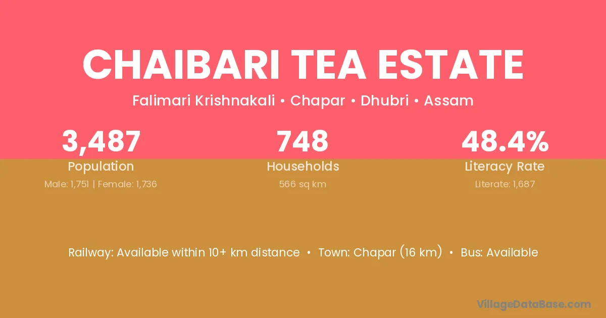 Chaibari Tea Estate village has a total population of 3,487 people, of which 1,751 are males and 1,736 are females.