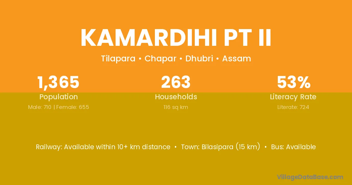 Bilasipara (15 km) is the nearest town to Kamardihi Pt Ii village for major economic activities and is located approximately 15 km away.
