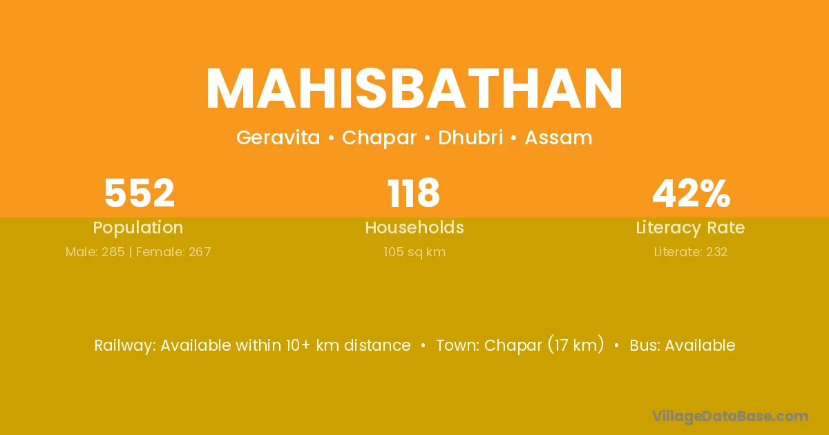 Chapar (17 km) is the nearest town to Mahisbathan village for major economic activities and is located approximately 17 km away.