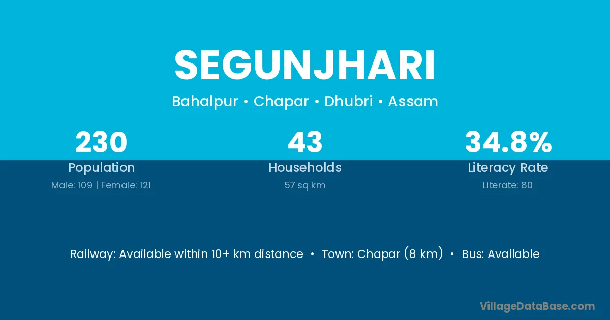 Chapar (8 km) is the nearest town to Segunjhari village for major economic activities and is located approximately 8 km away.