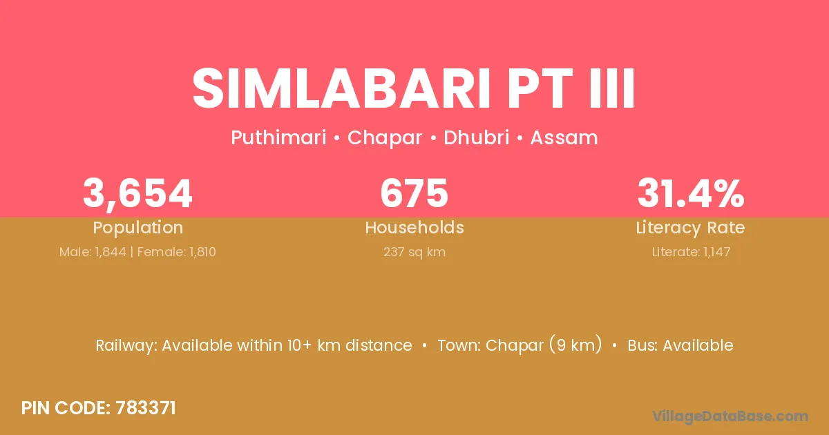 Chapar (9 km) is the nearest town to Simlabari Pt Iii village for major economic activities and is located approximately 9 km away.