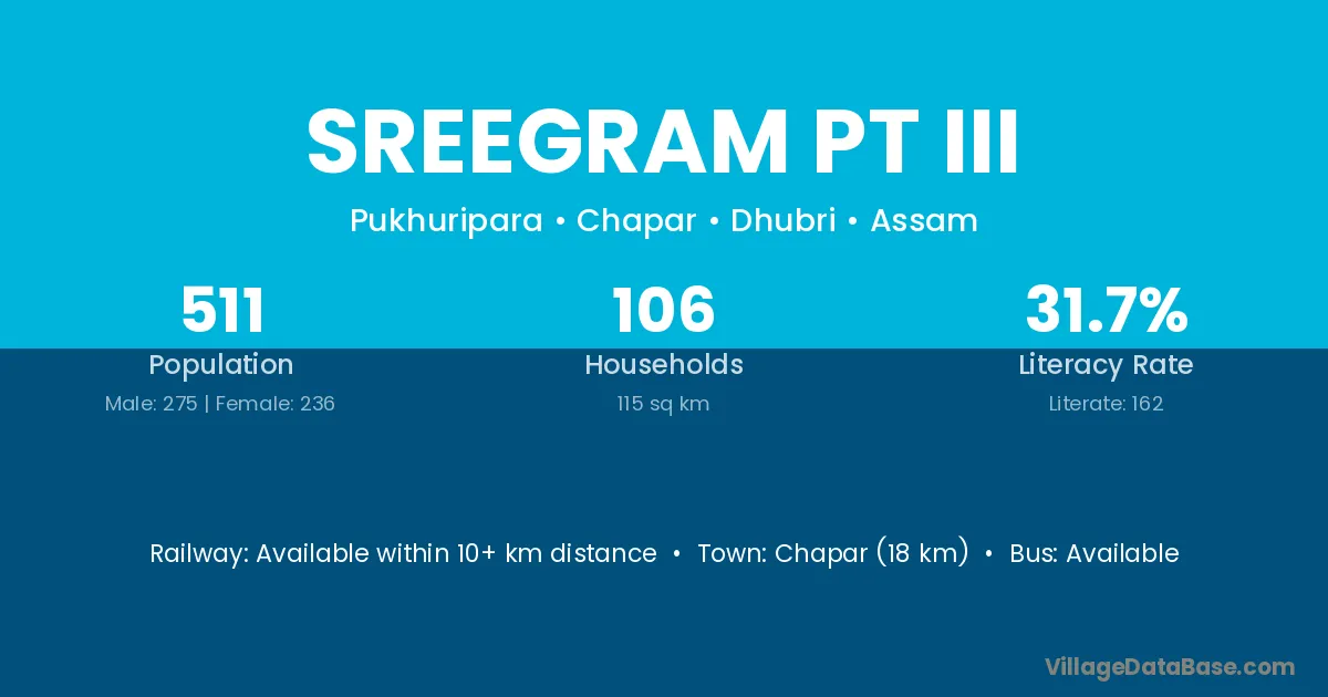 Chapar (18 km) is the nearest town to Sreegram Pt Iii village for major economic activities and is located approximately 18 km away.
