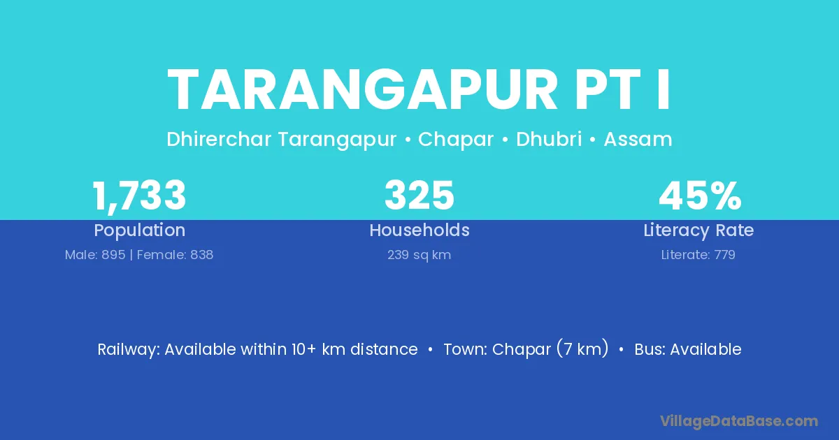 Chapar (7 km) is the nearest town to Tarangapur Pt I village for major economic activities and is located approximately 7 km away.