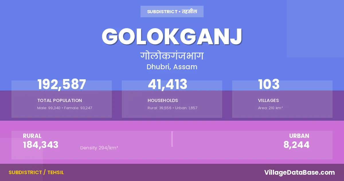 According to the 2011 census The total area of Golokganj Subdivision is 210 km², with a population of 192587 people. The population density is 294 inhabitants per square kilometre, and there are approximately 41413 houses in the sub district.
