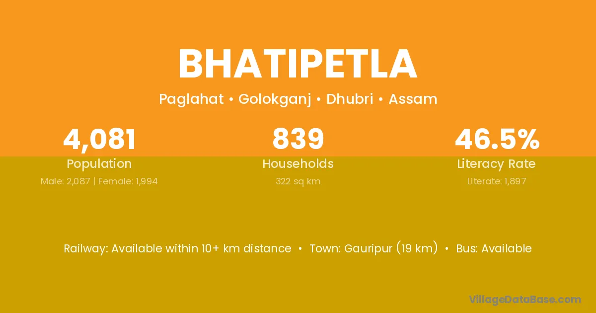 Gauripur (19 km) is the nearest town to Bhatipetla village for major economic activities and is located approximately 19 km away.