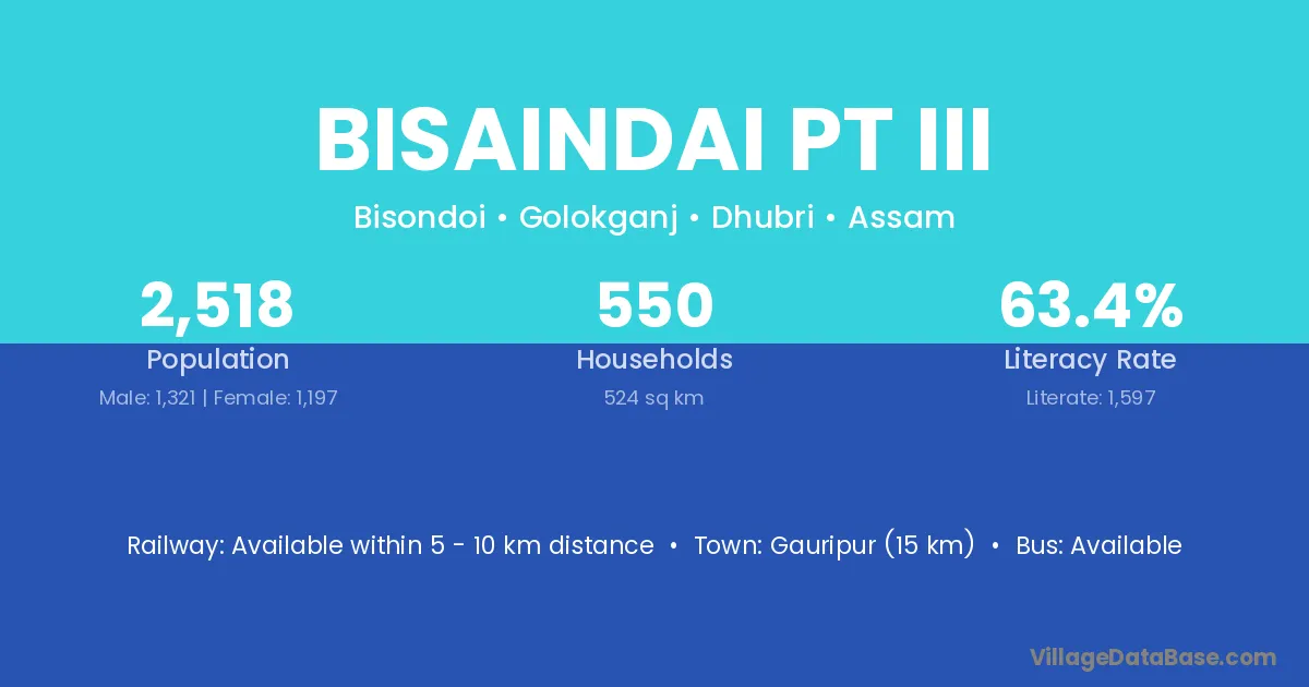 Gauripur (15 km) is the nearest town to Bisaindai Pt Iii village for major economic activities and is located approximately 15 km away.