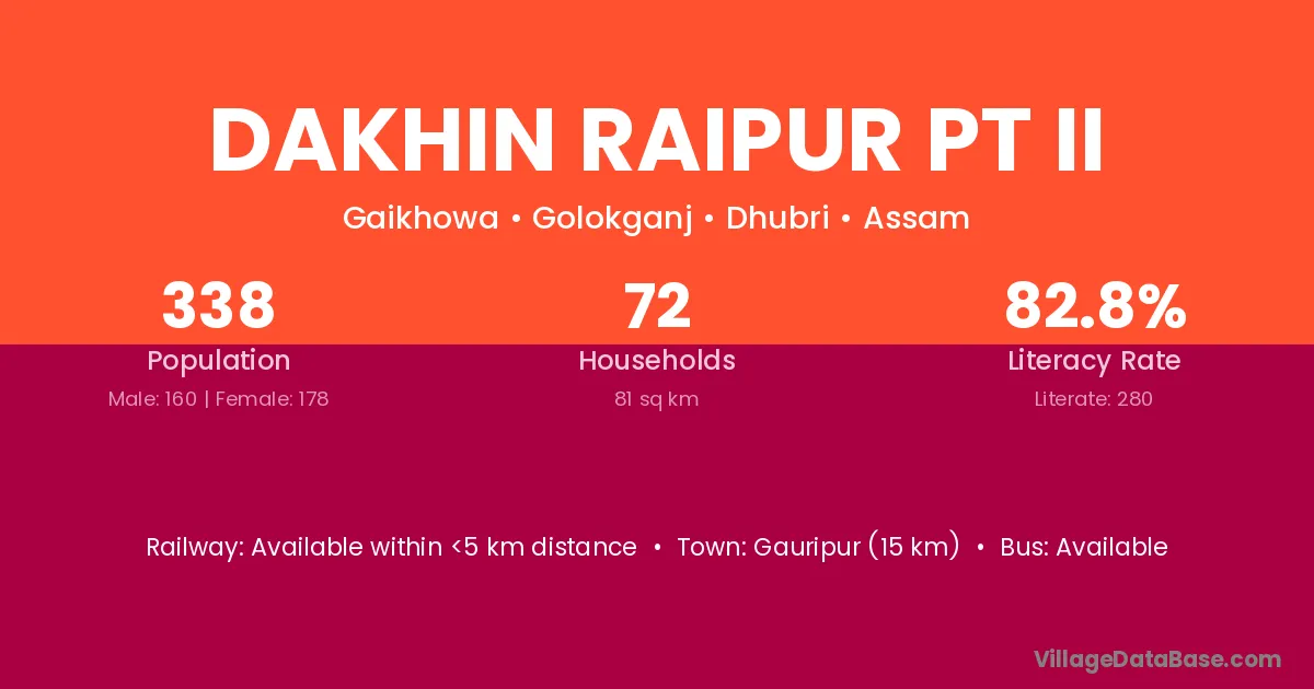 Dakhin Raipur Pt Ii village has a total population of 338 people, of which 160 are males and 178 are females.