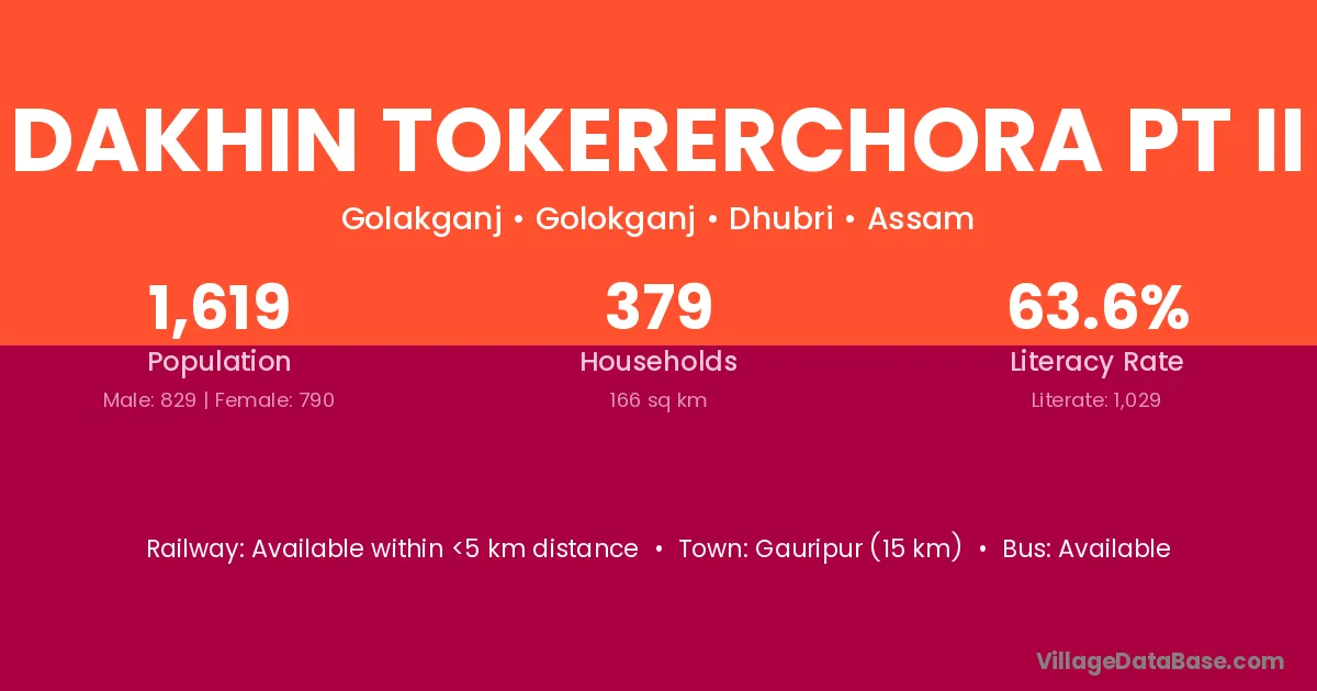 Dakhin Tokererchora Pt Ii village has a total population of 1,619 people, of which 829 are males and 790 are females.
