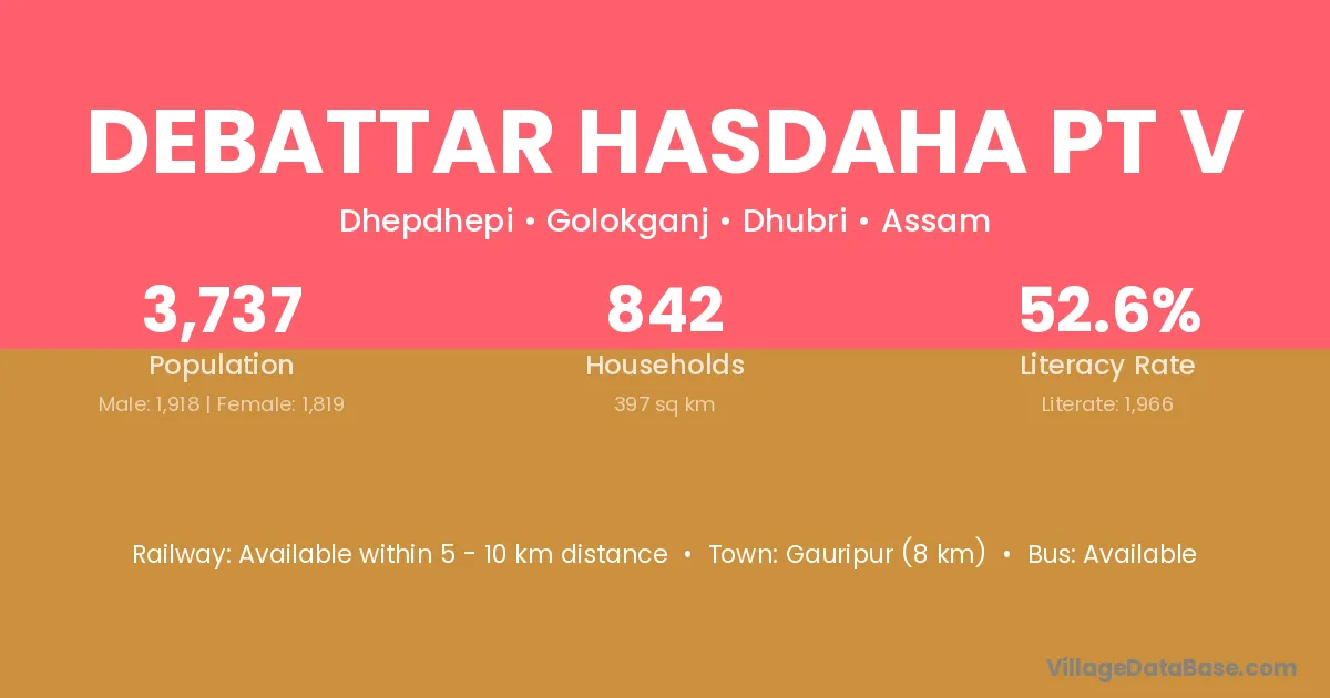 Gauripur (8 km) is the nearest town to Debattar Hasdaha Pt V village for major economic activities and is located approximately 8 km away.