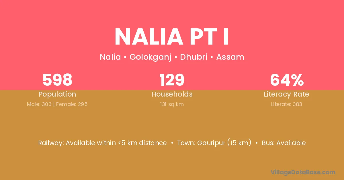 Gauripur (15 km) is the nearest town to Nalia Pt I village for major economic activities and is located approximately 15 km away.