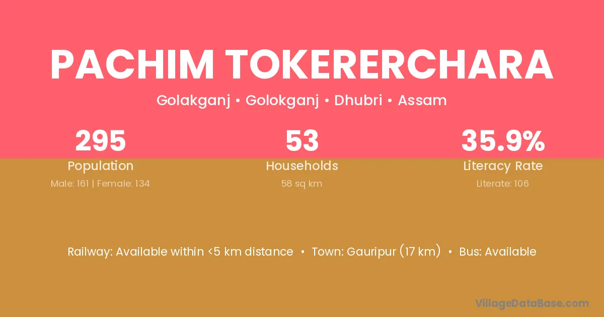 Pachim Tokererchara village has a total population of 295 people, of which 161 are males and 134 are females.